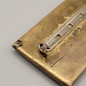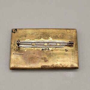 Turquoise Chips in Brass Setting Brooch in rectangle shape. A brass design on the front looks like two ram heads, maybe astrological sign Aries? Made in India . Safety clasp. Unbranded.