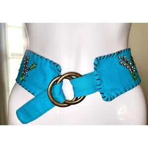 Turquoise Cotton Beaded Belt, Stitching, beads, sequins, dress up or down, M/L
