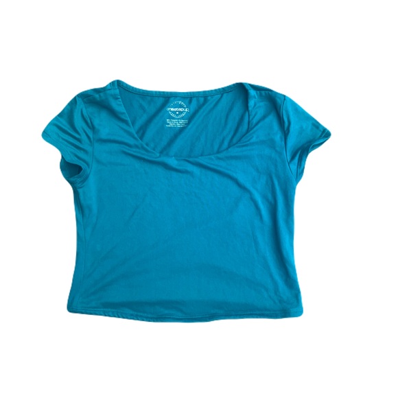 Soft short-sleeve crop top. Scoop neckline. Lightweight knit fabric. Simple solid color for easy styling.
