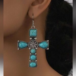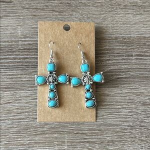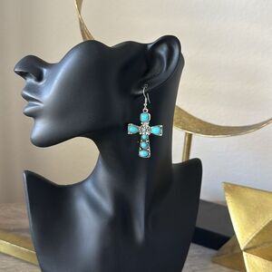Beautiful turquoise cross earrings with silver detailing. Perfect for any occasion.