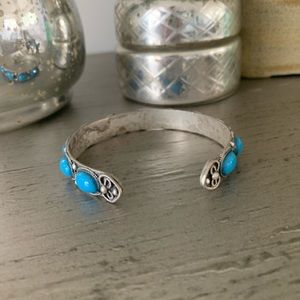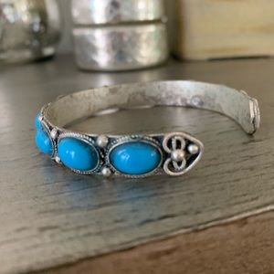 Tibetan Silver with Turquoise stone inlay. Heart details on each end make this a perfect stacking piece.