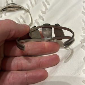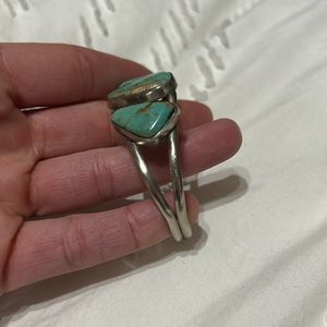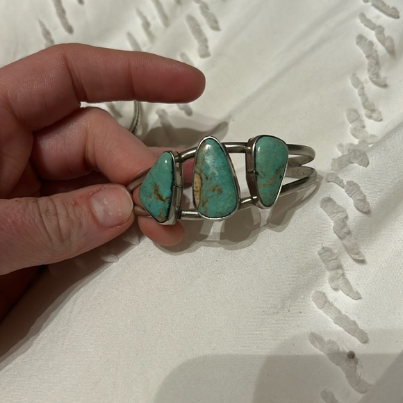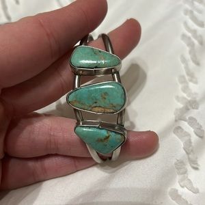 medium sized vintage Kingman turquoise cuff. three stones with adjustable silver band open shank design