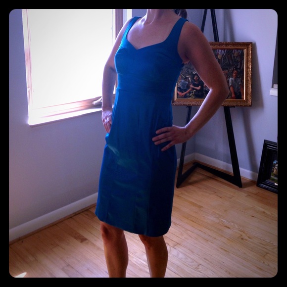 Shiny, satiny, stretch dress in brilliant turquoise. Worn once for a wedding. Machine washable.