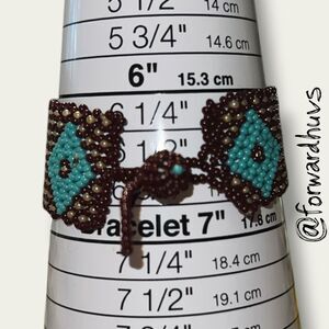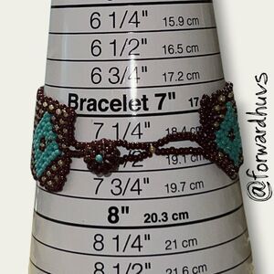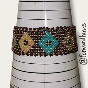 This artisan-crafted beaded bracelet features a striking diamond motif in turquoise, gold, beige, and deep brown tones, bordered by a consistent dark edge for contrast. The intricate beadwork is symmetrical and tightly woven, showcasing exceptional craftsmanship.