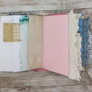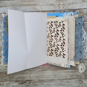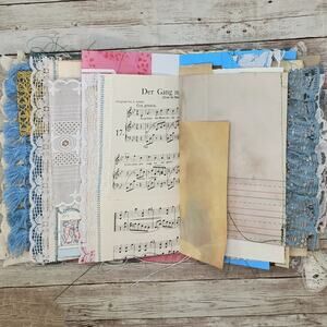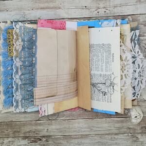 Never Look Back: a turquoise, pink, and purple flower, birds, and butterfly junk journal. This two signature beauty has a handmade fabric cover. It provides a wonderfully unique way to journal for any purpose, scrapbook, or store your keepsakes. This is a lovely way to stay organized while expressing yourself. I don't use kits or templates in my work, ensuring a unique journal you won't find anywhere else.