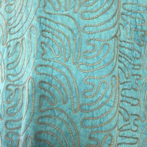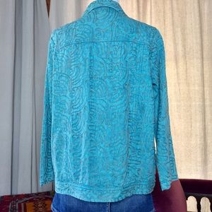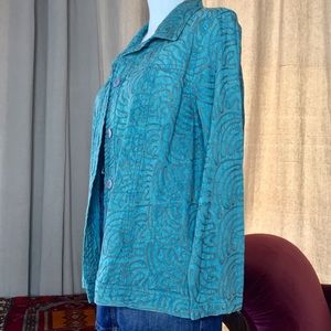 Vintage turquoise crewel embroidered jacket by Shaver Lake in woman’s size large. Button front with a classic denim jacket cut with a twist