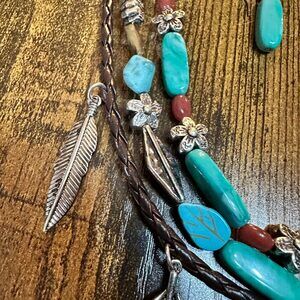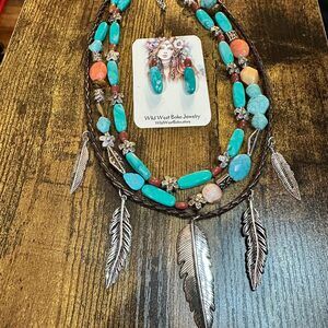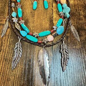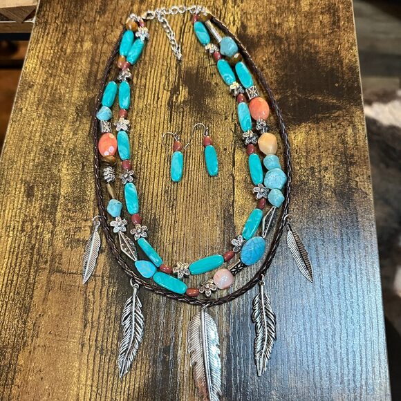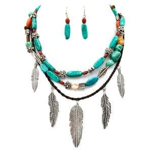 Turquoise Feather Southwestern Boho Multi Necklace and Earrings Set