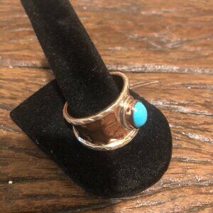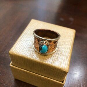 Turquoise Gemstone Ring - Oval Shape - Wide Hammered Copper Band - Gem Color: Blue - Size: 10- Stamped 925 /CU India- Good Condition