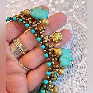 This stunning necklace features turquoise and gold elephant charms, as well as gold jingle bells. This is a charming costume piece. Composite elephants, jingling brass bells, gold tone elephants and beads.