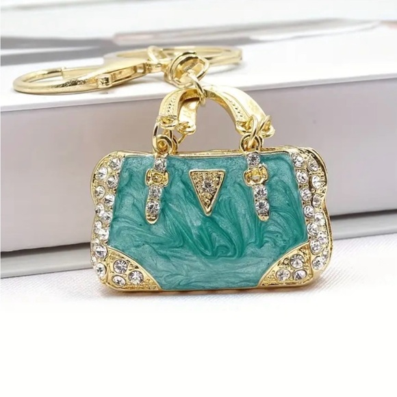 Elegant turquoise teal handbag keychain with gold accents and rhinestone details.