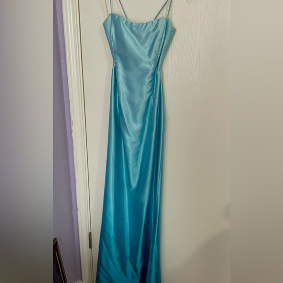 Stunning turquoise ombre gown with rhinestone trim and matching shawl. Suitable for petite xs sizes and for people 5” or 5’1” with heels. Gorgeous back with stone trim. Perfect for prom or other upcoming spring or summer formal events!