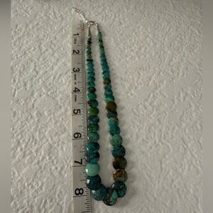 Elegant turquoise beaded necklace perfect for any occasion. Add a touch of color to your outfit with this stunning piece,this coin turquoise necklace is original from the Native American Navajo,one of a kind master piece,finished with silver 925 closure and extension,accept otters, tree gift with each purchase, same day shipping.