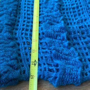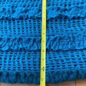 This knit turquoise infinity scarf is a fabulous piece for fall. The slight ombre on each end gives way to a lighter turquoise in the center. The waffle texture with a ribbon detail adds pizzazz to this accessory. From a non-smoking home, the scarf has never been worn.