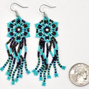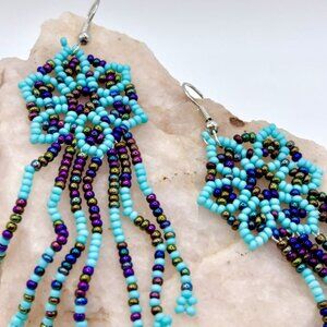 These exquisite hand-beaded tassel earrings feature an intricate flower pattern with eight graceful tassels dangling below. The vibrant blend of matte turquoise and shimmering iridescent black "peacock" seed beads brings a striking splash of color to your look. Designed to catch and reflect light beautifully, they add a captivating sparkle to any ensemble.