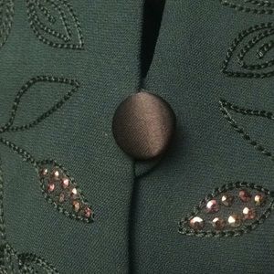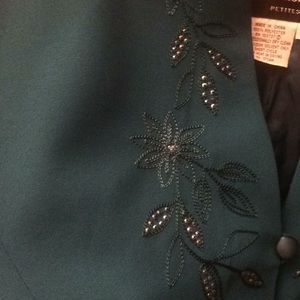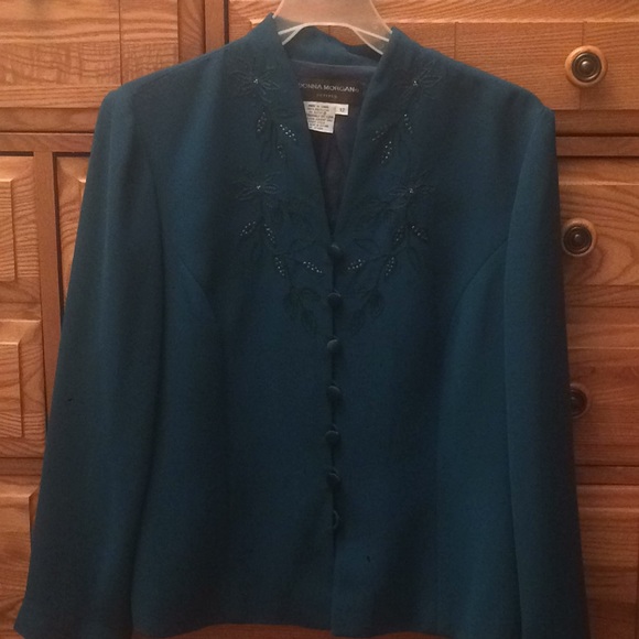 It is a vibrant turquoise but it doesn’t really show up with the camera. It is embroidered with flowers made out of beads. It’s an elegant work jacket. It has been used before but it is still in great condition.