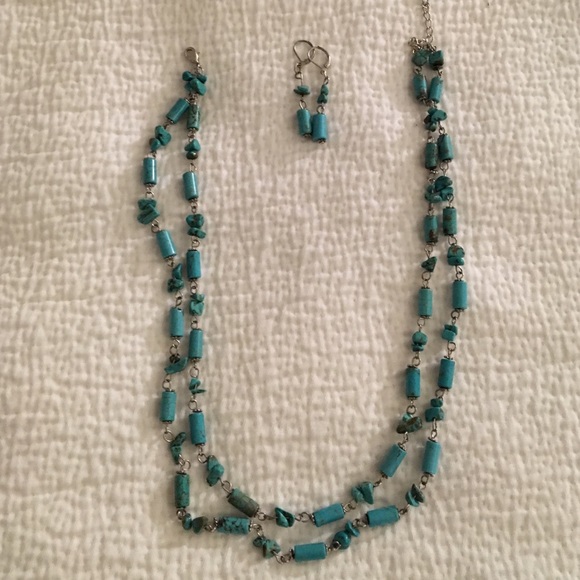 Matching turquoise drop earrings and necklace with silver chain. Measures approximately 7" when worn.
