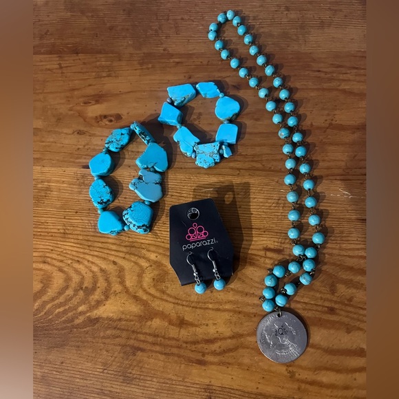Chic set with vibrant blue beads. Includes necklace, bracelet, and earrings. Perfect for a stylish look. Bracelets and necklace are NOT Paparazzi.