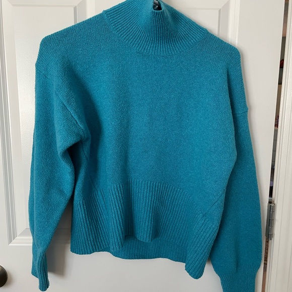 Cozy turquoise knit sweater with mock neck. Super soft and has a lot of stretch. Fits loose with fitted sleeves. A New Day XS, EUC, smoke free home.