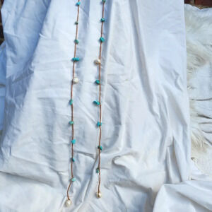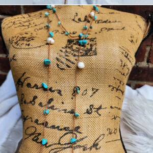 This gorgeous piece is about 72 inches long and the turquoise is real. Pearls are likely cultured pearls. All gems a on a handmade fabric cord