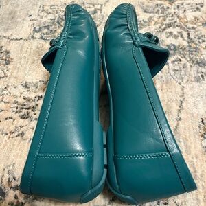 Elegant turquoise loafers with woven chain-like detail. Comfortable and stylish for any occasion.