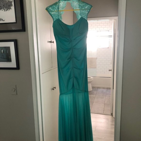 Classy mermaid-style prom dress. Size 4 but has stretch. Forgiving in stomach area due to the design. Sweetheart neckline with a lace backing that clips at the neck. Good condition. Worn once to prom but works as a wedding guest dress as well. Surprisingly comfortable and despite mermaid style, easy to walk in.