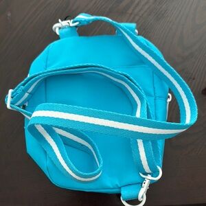 Stylish turquoise mini backpack with front pocket and adjustable strap.