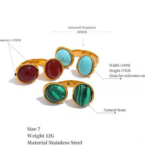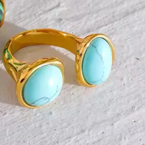 This ring features an open-ended design with two striking oval turquoise stones set in a 18K Gold stainless steel band, plated with a rich gold finish. The use of stainless steel ensures durability and resistance to tarnish, while the gold plating adds a luxurious sheen that enhances the overall elegance of the piece. The turquoise stones are smooth with natural veining, providing a unique, artisanal touch. The combination of the vibrant blue-green hue of the stones and the warm gold plating creates a beautiful contrast. With its adjustable open design, this ring offers both style and comfort, making it a versatile accessory suitable for any occasion. Its modern yet timeless appeal makes it ideal for both stacking with other rings or wearing alone as a statement piece.