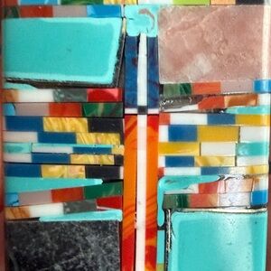 Stylish turquoise multi-color inlay money clip. Features vibrant turquoise and multicolored geometric inlay for a bold look. Lightweight and secure design that adds flair. Turquoise and accent colors create a standout finish.