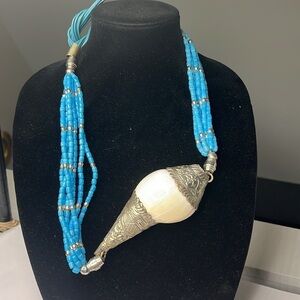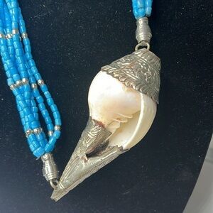 This is a gorgeous custom hand crafted Turquoise Multi-strand Silver and Large Natural Shell Necklace with Leather Ties. This piece is glorious. A one of a kind. All natural of shell, silver, glass turquoise, metal and leather. Full length is 16” and can be adjusted or shortened by tying the necklace to where you need it. The large shell is 5.5” long and approximately 2.5” deep