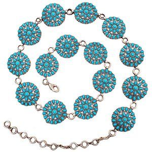 • Turquoise Natural Stone Antique Metal Squash Blossom Boho Westen Style Link Belt