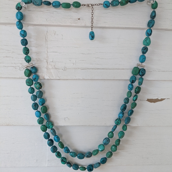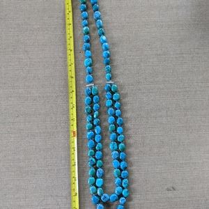 This is a turquoise necklace with both blue and green stones. Approx 18" long (see pic). Knotted in between each stone. Clasp allows for length adjustment.