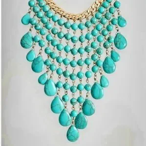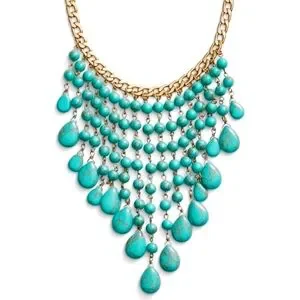 Adia Kibur Spray Statement Necklace. A gorgeous waterfall of turquoise beads cascade down from a polished gold link chain.