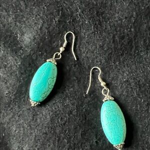 Elegant turquoise oval drop earrings with silver accents. Perfect for adding a pop of color to any outfit.