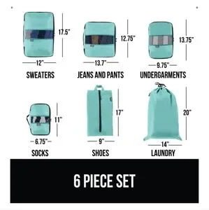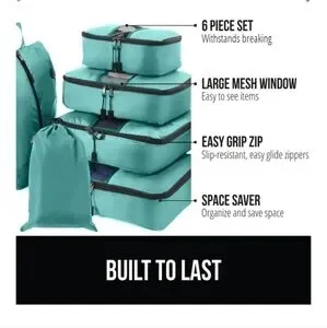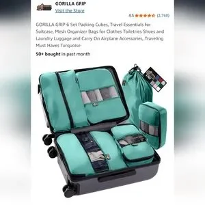 Organize your travel with this turquoise packing cube set. Includes multiple sizes for efficient packing. Gorilla Grip. Brand new, never opened. Still in plastic bag as pictured.
