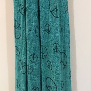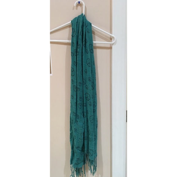 Turquoise scarf covered in kitschy peace signs! Tasseled bottom and super soft fabric.