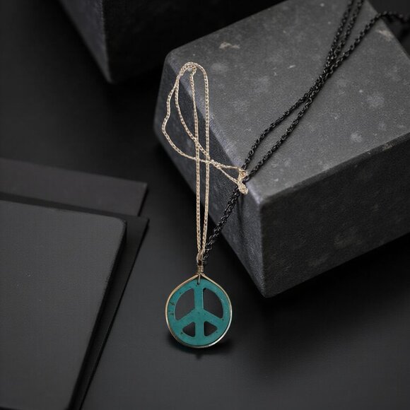 This is a Turquoise Peace Sign Necklace fairly large about size of an oreo or bigger around. Silver plated chain Necklace.