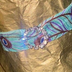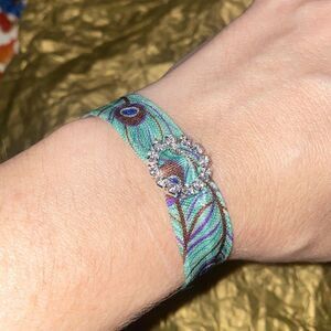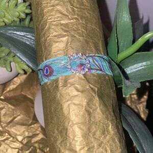 Turquoise Peacock Feather Rhinestone Charm Hair Tie Ponytail Holder Bracelet