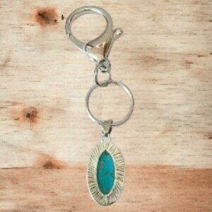 Silver key chain with a silver alloy and turquoise oval pendant. It can also be attached to your handbag.