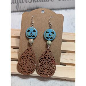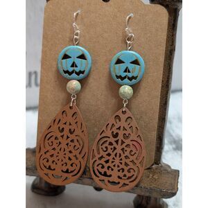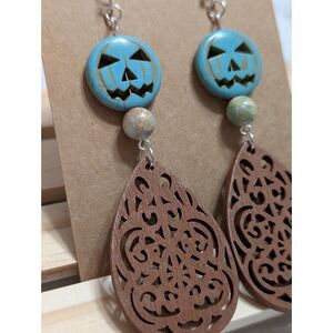 Step away from the traditional with these gorgeous Boho Halloween Dangle Earrings. They feature a bold, carved turquoise Jack-O'-Lantern bead with a mischievous grin. Below, a small, marbled earth-tone bead connects to a large, teardrop-shaped natural brown wood pendant. The wood is intricately laser-cut with a detailed filigree pattern, creating an elegant, airy piece that’s perfect for fall festivals or a chic, non-traditional Halloween look.