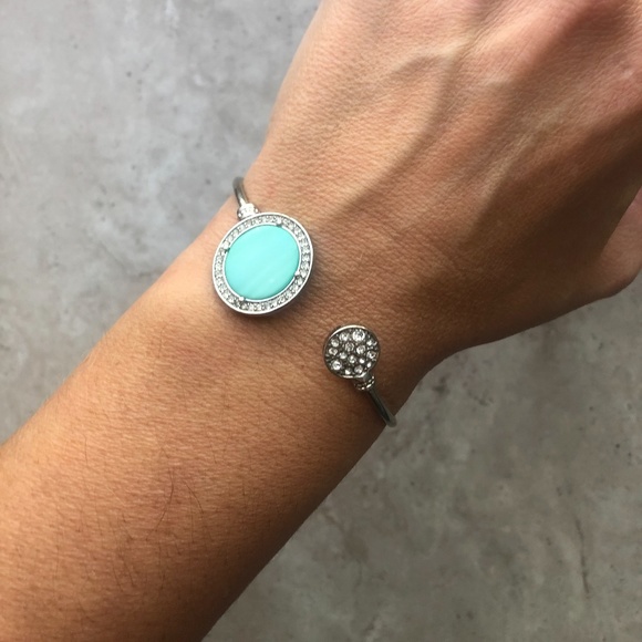 Turquoise & rhinestone circles on a silver open bangle, no flaws.
