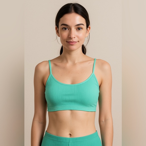 Experience comfort and style with this turquoise ribbed bandeau top. Perfect for layering or wearing alone, it offers a snug fit with its soft fabric. In new condition. Small make up stain that comes out.