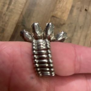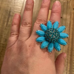 Large Turquoise flower with blue crystals in the center of the flower. Stretchy band to fit any finger of any size