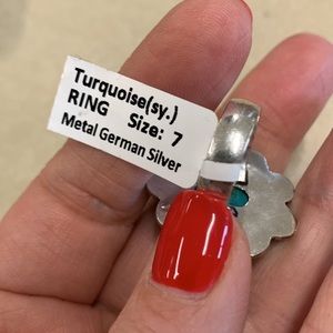 This ring is synthetic turquoise set in German silver. Own a beautiful turquoise piece for a fraction of the price! Gorgeous flower design and rope work in the metal. This is brand new with tags!