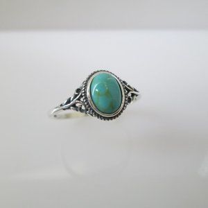 For your consideration is this oh so pretty 925 sterling silver and genuine turquoise ring. Simple, comfortable, and beautifully crafted. Face height on this = 10mm. A little oxidized detailing is a great accent to this lovely oval turquoise stone. Various sizes in the dropdown.