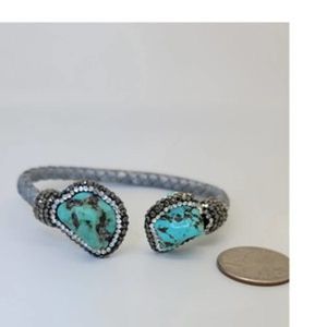 Unique Silver Tone Woven Leather Cuff One Size, Tumbled Turquoise, Round White, and Silver Crystals accents.