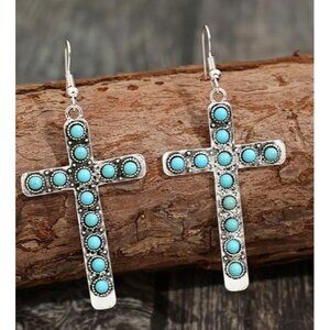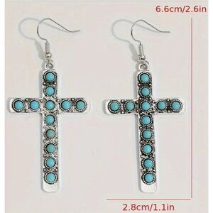 Elegant cross dangle earrings with faux turquoise stones and silver-tone finish, ideal for adding sophistication to any outfit.