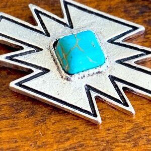 A diamond-shaped frame holds bright turquoise-colored stones, set off by a weathered silver tone finish.