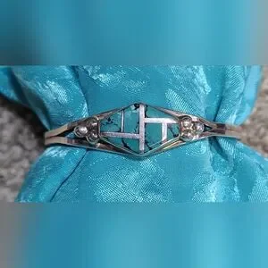 Beautiful turquoise bracelet with silver inlay. Unique geometric design. Perfect for any occasion. Item is sterling silver and scratch-tested. Stamped Sterling w/ artist marking K