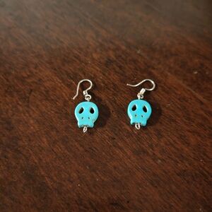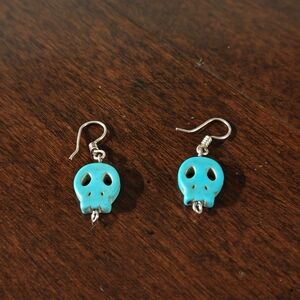 Unique turquoise skull earrings with silver hooks. Perfect for a bold look.