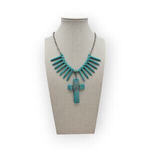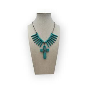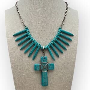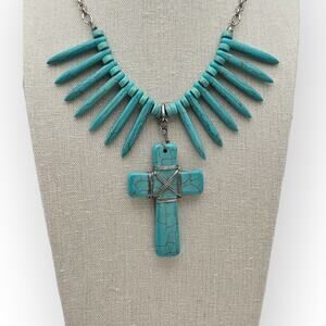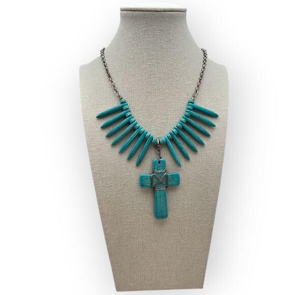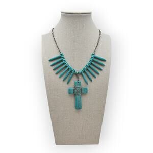 This striking statement necklace features vivid turquoise-tone spike beads arranged in a dramatic fan silhouette, anchored by a bold cross pendant at center. The design has a strong Southwestern / bohemian energy, blending earthy texture with symbolic detail for a piece that feels both powerful and expressive.